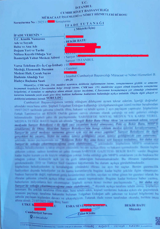 Sarıyer Gazetesi İmtiyaz Sahibi ve Genel Yayın Yönetmeni Bekir Batu, kendisi hakkında twitter hesabından paylaşımlar yapan Tolgahan Erdoğan hakkında İstanbul Cumhuriyet Başsavcılığı’na suç duyurusunda bulundu. 30 yıllık gazeteci olduğunu, Marmara Üniversitesi İletişim Fakültesi Gazetecilik Bölümü’nden 25 yıl önce diploma aldığını söyleyen Batu, şüphelinin kendisini tanımadığı halde hakkında iftira, hakaret ve tehdit içeren twittler paylaştığını belirtti. Fettah Tamince’ye ait Rixos Otel’de garson- servis elemanı olduğunu öğrendiği şüphelinin, yaptığı paylaşımlarının tamamen iftira, yalan ve yanlış olduğunu belirten Batu, gazetecilik itibarına zarar vermek isteyen bu kişiye ve onunla birlikte hareket edenlere karşı iddianame düzenlenmesini istedi.