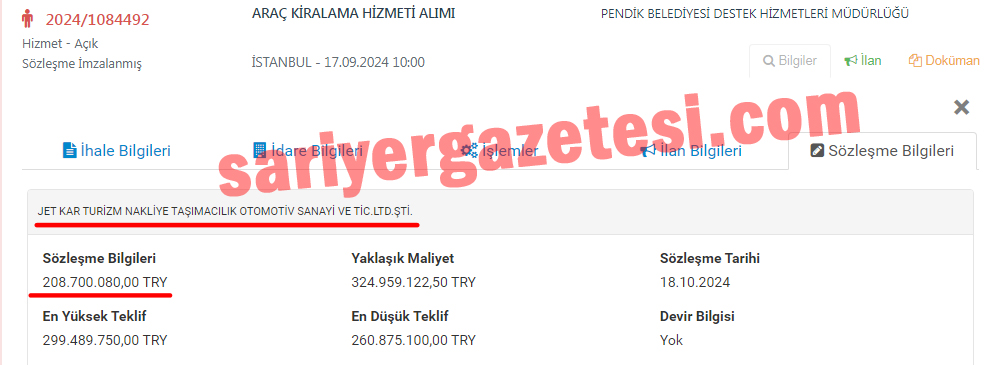AK Partili Pendik Belediyesi‘nin düzenlediği 43 kalemden oluşan araç kiralama ihalesini, 208 milyon 700 bin liraya JET KAR TURİZM NAKLİYE TAŞIMACILIK OTOMOTİV SANAYİ VE TİCARET LİMİTED ŞİRKETİ kazandı. Şirket, 30 Eylül’de CHP’li Eyüpsultan Belediyesi’yle 556 milyonluk araç kiralama ihalesi sözleşmesi de imzalamıştı.