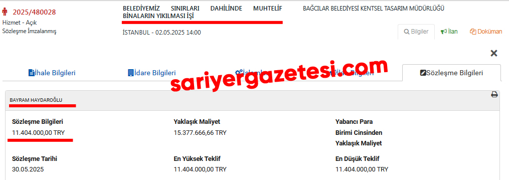 Bağcılar Belediyesi, ilçe genelindeki 200 adet kaçak yapının yıkılması için düğmeye bastı. Bağcılar Belediyesi Kentsel Tasarım Müdürlüğü tarafından “Belediyemiz sınırları dahilinde muhtelif binaların yıkılması işi” adıyla açılan ihale, 2025/480028 kayıt numarasıyla 2 Mayıs 2025 tarihinde saat 14.00’te gerçekleştirildi. Güneşli Mahallesi Mahmut Bey Caddesi No:97 adresinde yapılan ihalede yaklaşık maliyet 15 milyon 377 bin lira olarak belirlendi. İhalede yıkım işlemlerinin 7 ay içinde tamamlanması istendi. Yıkım ihalesini verdiği tek geçerli teklifle Bayram Haydaroğlu isimli şahıs firması kazandı. Bağcılar Belediyesi ile firma arasında 30 Mayıs 2025 tarihinde tam 11 milyon 404 bin liralık sözleşme imzalandı.