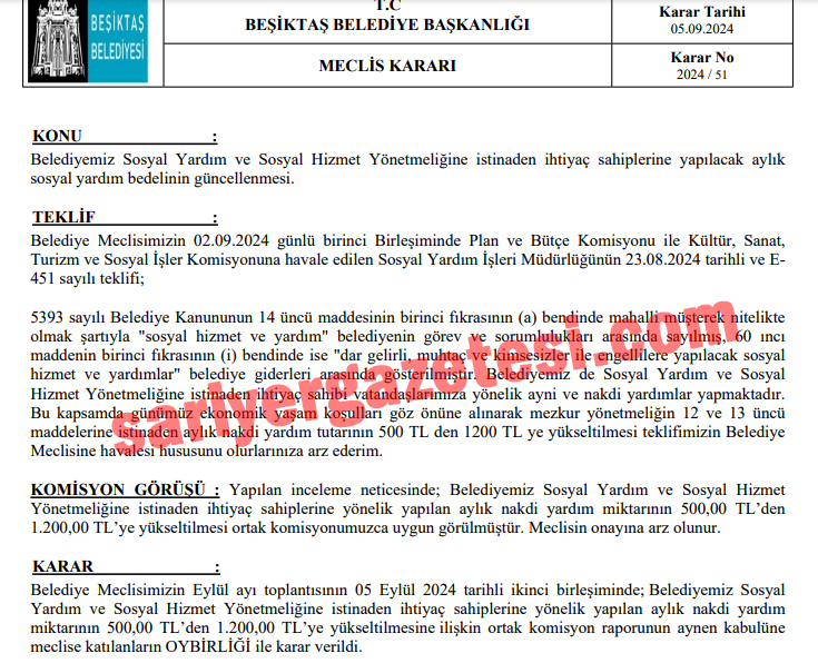 Beşiktaş Belediye Meclisi Eylül ayı oturumunda “Belediyemiz Sosyal Yardım ve Sosyal Hizmet Yönetmeliğine istinaden ihtiyaç sahiplerine yapılacak aylık sosyal yardım bedelinin güncellenmesi” teklifini görüştü. Dar gelirli, muhtaç ve kimsesiz ile engellilere yapılan sosyal yardım miktarının arttırılması yönündeki teklif komisyondan geçti. Komisyon görüşünde; “Yapılan inceleme neticesinde; Belediyemiz Sosyal Yardım ve Sosyal Hizmet Yönetmeliğine istinaden ihtiyaç sahiplerine yönelik yapılan aylık nakdi yardım miktarının 500 TL’den 1.200 TL’ye yükseltilmesi ortak komisyonumuzca uygun görülmüştür” denildi.