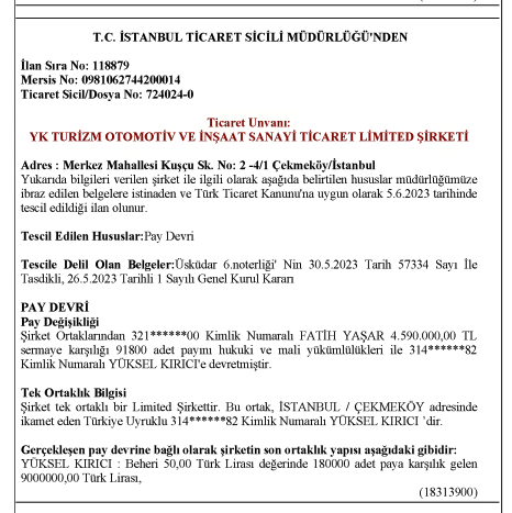 YK TURİZM OTOMOTİV VE İNŞAAT SANAYİ TİCARET LİMİTED ŞİRKETİ