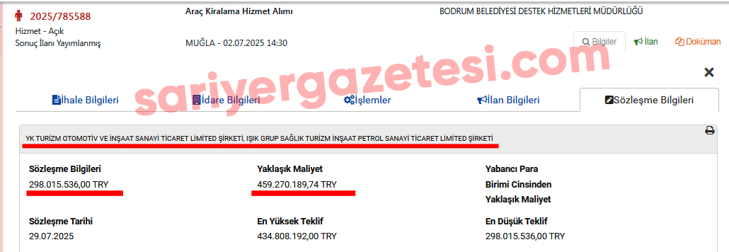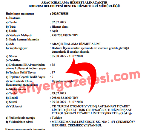 Bodrum Belediyesi’nin düzenlediği araç kiralama ihalesine katılmak için tam 35 farklı şirket şartname satın aldı.İhaleye bu şirketlerden tam 17 tanesi katıldı. Ancak bu şirketlerden 7 tanesi geçerli teklif sundu. Katılımcı 7 şirket arasında yaşanan kıran kırana rekabet sonucu ihale ilginç bir bedelle tamamlandı. 459 milyon yaklaşık maliyeti bulunan ihale, tam 161 milyon düşük bedelle 298 milyon 15 bin liraya tamamlandı. İhalede en yüksek teklif 434 milyon 808 bin lira oldu. İhaleyi İstanbul merkezli YK TURİZM OTOMOTİV VE İNŞAAT SANAYİ TİCARET LİMİTED ŞİRKETİ ve IŞIK GRUP SAĞLIK TURİZM İNŞAAT PETROL SANAYİ TİCARET LİMİTED ŞİRKETİ ortaklaşa kazandı. İkili şirket ile belediye arasında 29 Temmuz 2025 tarihinde 298 milyon 15 bin 536 liralık sözleşme imzalandı. Böylece, bol rekabetli ihale nedeniyle tam 161 milyon lira Bodrum Belediyesi’nin kasasında kalmış oldu. Sözleşme gereği, ikili şirket 5 Ağustos 2025- 31 Temmuz 2028 yılları arasında belediyeye kiralık araç hizmeti verecek.