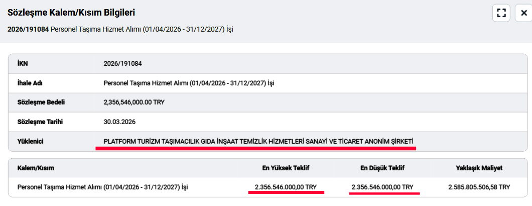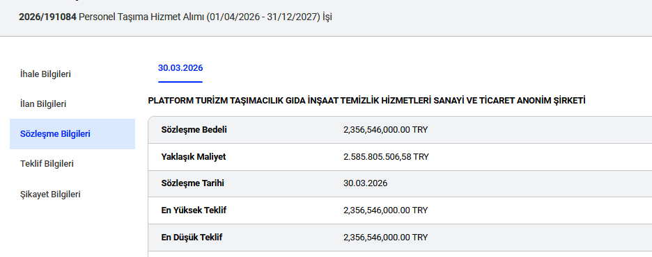 İstanbul Büyükşehir Belediyesi‘nden bugüne kadar milyarlarca liralık araç kiralama ihalesi almasıyla bilinen Platform Turizm, İBB’den 2 milyar 356 milyon 546 bin liralık yeni bir ihale daha aldı. 30 Mart 2026 (bugün) tarihinde imzalanan sözleşmeye göre Platform Turizm, İBB’yle 31 Aralık 2027 tarihine kadar sözleşme imzaladı. Dev ihale verilen tek geçerli teklifle bu şirketin oldu.