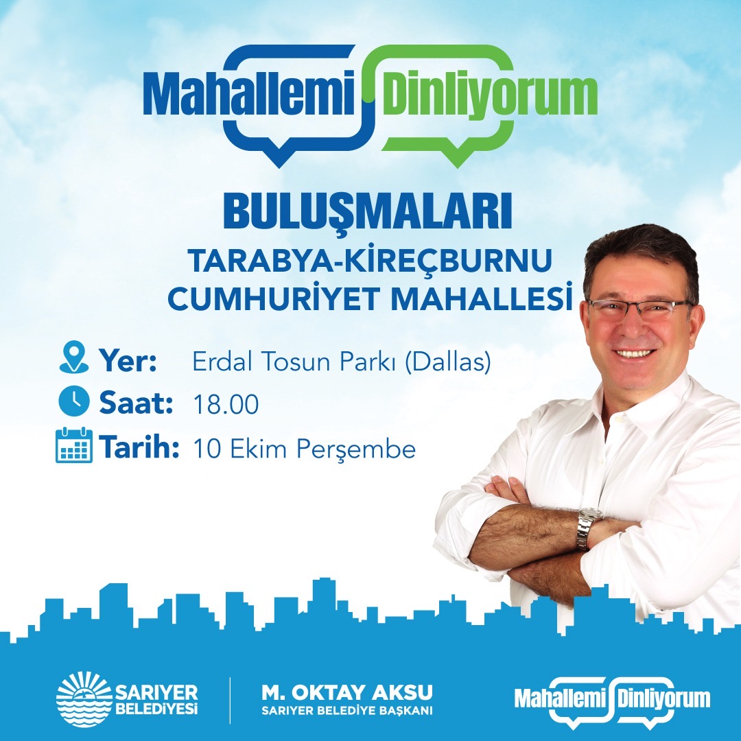 Tarabya, Kireçburnu ve Cumhuriyet Mahallelerininsorunlarının konuşulacağı ve çözüm önerilerinin değerlendirileceği toplantı 10 Ekim Perşembe günü saat 18:00’de Erdal Tosun Parkı (Dallas)’ta gerçekleştirilecek.