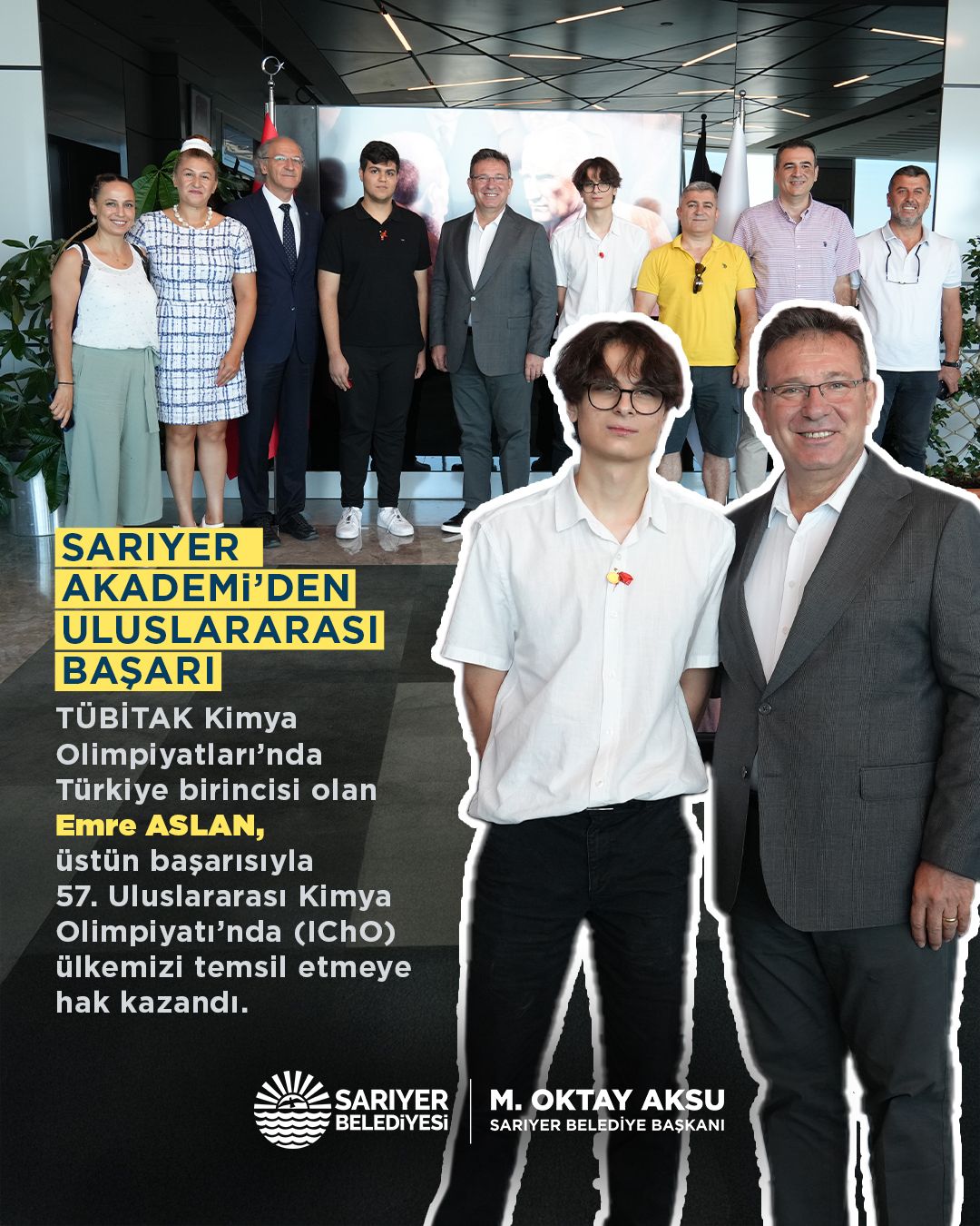 Sarıyer Akademi öğrencisi Emre Aslan’ı makamında ağırlayarak tebrik eden Sarıyer Belediye Başkanı M. Oktay Aksu, “Öğrencimiz Emre Aslan’ı başarılarından dolayı tebrik ediyorum. Sarıyer’imizin gururu öğrencimiz Emre’nin yetişmesinde emeği geçen herkese teşekkür ediyorum. Emre’mizin bizleri uluslararası yarışmada da en iyi şekilde temsil edeceğine yürekten inanıyorum. Kendisine başarı ve bol şans diliyorum. Sarıyerli tüm komşularımızın iyi dilekleri Emre ile olacak” dedi.