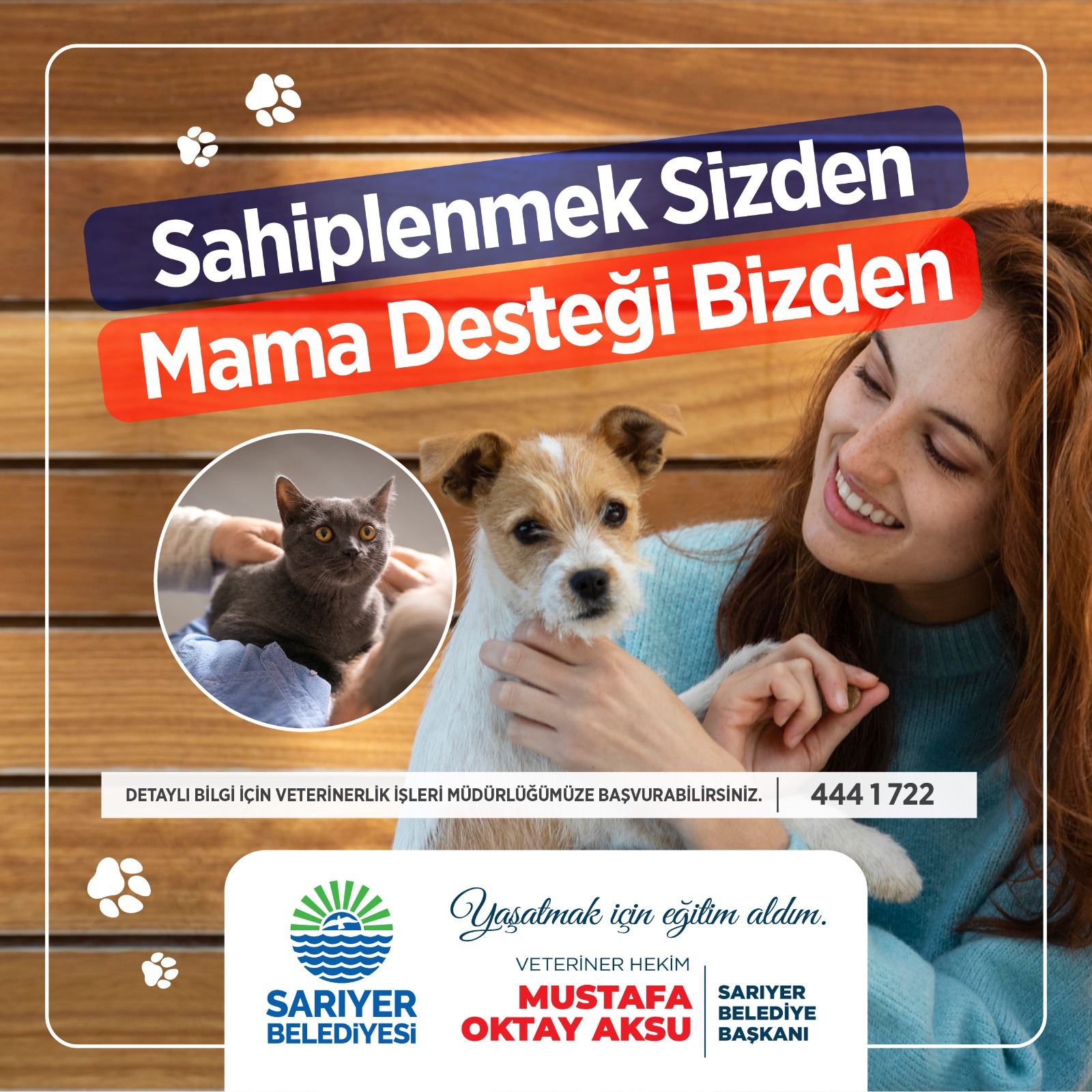 Sarıyer Belediye Başkanı Mustafa Oktay Aksu, mecliste kabul edilen Hayvanları Koruma Kanunu’nun ardından Sarıyer sınırları içinde sokak hayvanlarını sahiplenen vatandaşlara mama desteği verileceğinin duyurusunu yaptı. İlçede sokak hayvanlarına sahip çıkıp uyum içinde yaşamayı hedefleyen bir bakış açısına sahip olan belediye, öldürmek yerine yaşatmayı hedefliyor. Sarıyer Belediyesi,Safiye Kaya Sokak Hayvanları Geçici Bakımevinde rehabilite işlemleri tamamlanan hayvanların sahiplenilmesi sonucunda bir yıl boyunca mama desteği sağlayacak. Bunun için vatandaşların yapması gereken tek şey 4441722 numaralı telefondan Sarıyer Belediyesi Veteriner İşleri Müdürlüğü’ne ulaşmaları.