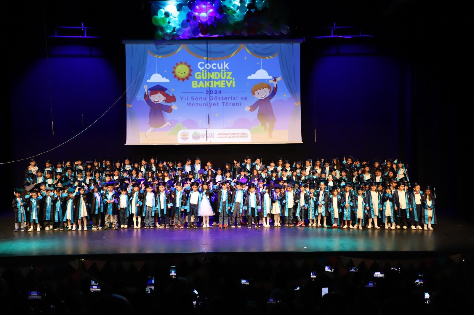 Sarıyer Belediyesi Çocuk Gündüz Bakımevleri’nde eğitimlerini tamamlayan 235 çocuk mezuniyet heyecanı yaşadı. Boğaziçi Kültür Sanat Merkezi’nde düzenlenen mezuniyet töreninde öğretmenler öğrencilerini mezun etmenin haklı gururunu yaşarken en az öğrenciler kadar heyecanlı olan veliler ise gösteriler sırasında duygusal anlar yaşadı. Birbirinden güzel gösteriler sahneleyen minikler programın sonunda mezuniyet belgelerini alarak kep attı. Programa velilerin yanı sıra; Sarıyer Belediyesi Başkan Vekili Hüseyin Coşkun, Başkan Yardımcısı Ayhan Gedik, Meclis Başkan Vekili Meltem Yücel Pir, birim müdürleri ve meclis üyeleri katıldı.