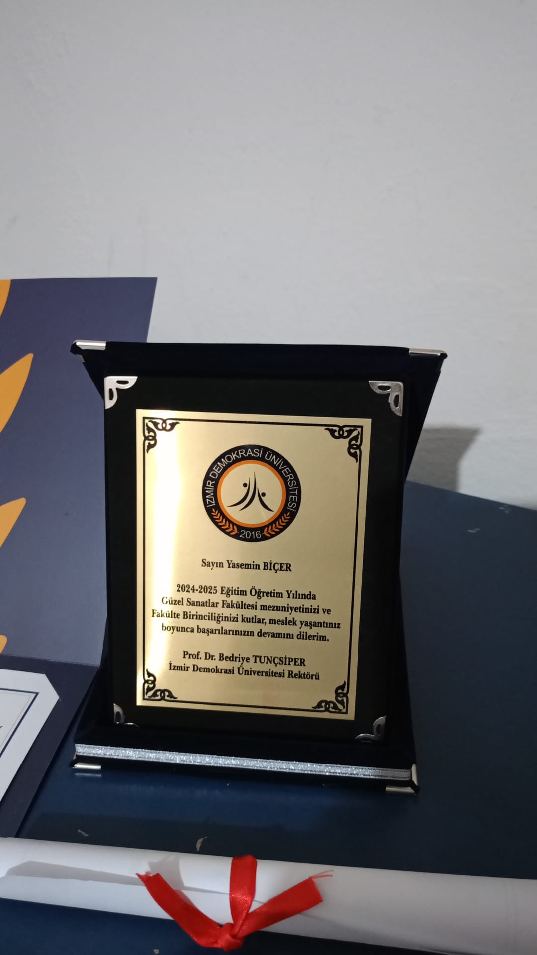 1967 yılında Ankara’da dünyaya gelen Yasemin Biçer, çocukluk yıllarında karikatür dergilerine çizim yaparken keşfettiği yeteneğini günümüze kadar uzanan sanat tutkusuyla besledi. İzmir Demokrasi Üniversitesi Geleneksel Türk Sanatları Bölümü’nden mezun olan Biçer, hem bölüm hem de fakülte birincisi oldu. Başarısıyla herkese örnek olan Yasemin Biçer, plaketini İzmir Demokrasi Üniversitesi 2024-2025 dönemi Rektörü Prof. Dr. Bedriye Tunçsiper’in elinden aldı.