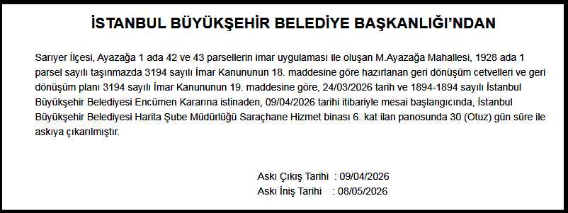 Sarıyer İlçesi, Ayazağa 1 ada 42 ve 43 parsellerin imar uygulaması ile oluşan M.Ayazağa Mahallesi, 1928 ada 1 parsel sayılı taşınmazda 3194 sayılı İmar Kanununun 18. maddesine göre hazırlanan geri dönüşüm cetvelleri ve geri dönüşüm planı 3194 sayılı İmar Kanununun 19. maddesine göre, 24/03/2026 tarih ve 1894-1894 sayılı İstanbul Büyükşehir Belediyesi Encümen Kararına istinaden, 09/04/2026 tarihi itibariyle mesai başlangıcında, İstanbul Büyükşehir Belediyesi Harita Şube Müdürlüğü Saraçhane Hizmet binası 6. kat ilan panosunda 30 (Otuz) gün süre ile askıya çıkarılmıştır.