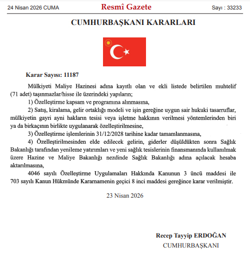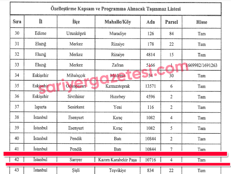 Cumhurbaşkanı Recep Tayyip Erdoğan tarafından Resmi Gazete’de 26 Nisan 2026 tarihinde 33233 sayı numarası ve 11187 karar numarasıyla yayımlanan kararnameyle Sarıyer’deki 95 bin 218 metrekarelik dev bir arazinin satılması istendi. Kararnamede ülke genelinde devlete ait 32 ildeki 71 adet taşınmazın 31 Aralık 2028 tarihine kadar satılması kararlaştırıldı. Özelleştirmeden elde edilecek gelirin Sağlık Bakanlığı’na aktarılacağı ifade edildi. Satılacak araziler listesinde Sarıyer’de çok önemli bir arazi de yer aldı.