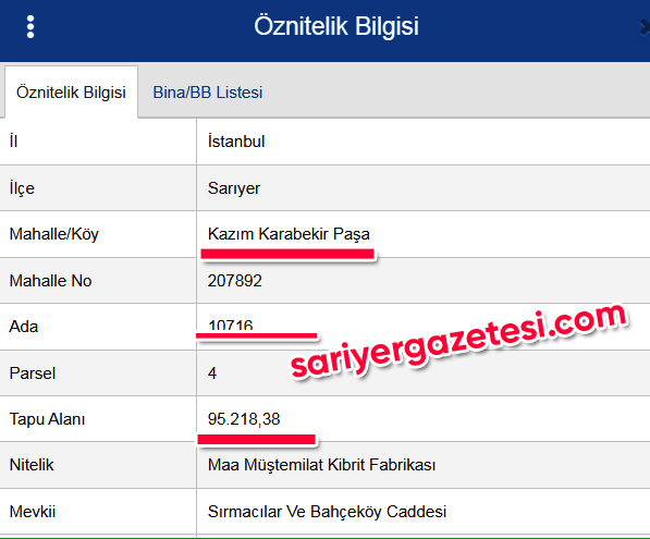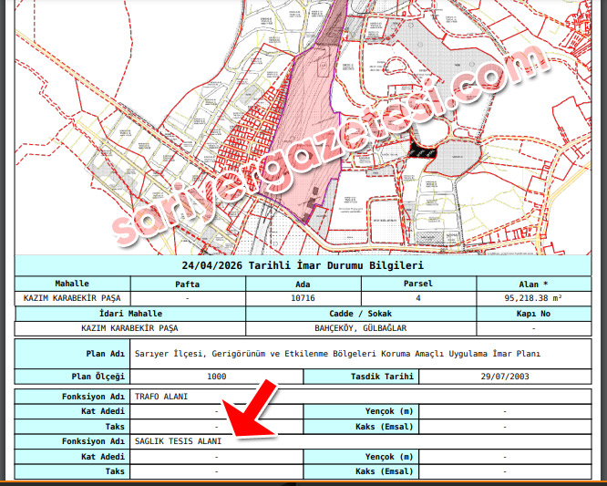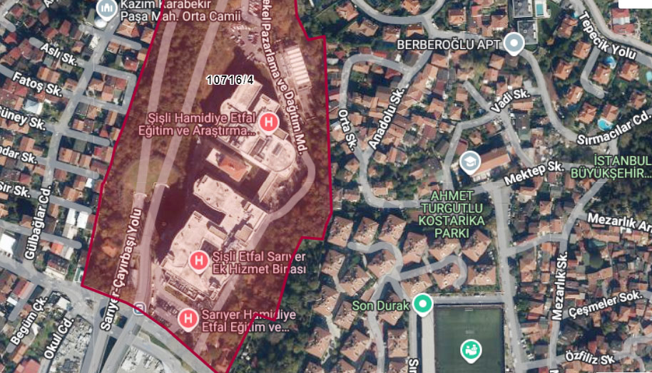 Cumhurbaşkanlığı kararnamesiyle Sarıyer’de satışa çıkartılması kararlaştırılan Kazım Karabekir Mahallesi 10716 ada, 4 parsel tam 95 bin 218 metrekare büyüklüğünde… Söz konusu arazinin tamamı Hazine’ye yani devlete ait. Sarıyer Gazetesi Genel Yayın Yönetmeni Bekir Batu‘nun yaptığı araştırmaya göre, Cumhurbaşkanlığı’nca satılması istenen arazi içinde Sarıyer Hamidiye Etfal Eğitim ve Araştırma Hastanesi ile Merhum Kadir Topbaş döneminde İstanbul Büyükşehir Belediyesi tarafından yaptırılan Çayırbaşı Tüneli de yer alıyor. Bahçeköy Caddesi üzerinde yer alan 4 parsel, Hamidiye Etfal Hastanesi’nden başlıyor ve Çayırbaşı Tüneli’ni de içine alarak Kozdere Pilavcısı’na kadar uzanıyor. Arazi üst kısımdan ise Cami Sokak boyunca Çeşme Üstü Merkez Camii‘ne kadar uzanıyor. Satılacak parsel içinde Tekel Pazarlama ve Dağıtım Müdürlüğü ile Trugo Şarj İstasyonu, otopark alanı ve çocuk oyun parkı da bulunuyor. Sarıyer Belediyesi İmar Müdürlüğü kayıtlarına göre söz konusu parsel Sağlık Tesis Alanı olarak görülüyor.