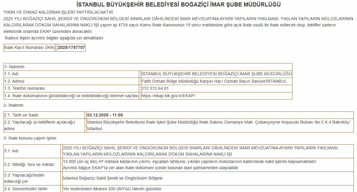İstanbul Büyükşehir Belediyesi bünyesindeki Boğaziçi İmar Müdürlüğü, boğaziçi öngörünümde kalan kaçak binaların yıktırılması, eşyalarının taşınması ve molozlarının kaldırılması için ihale düzenledi. 2025/1757707 kayıt numarasıyla açılan ihale kapsamında 13 bin metrekareye kadarlık yıkımın yapılması istendi. İhale, 3 Aralık 2025 tarihinde saat 11.00’de İstanbul Büyükşehir Belediyesi İhale İşleri Şube Müdürlüğü İhale Salonu Osmaniye Mahallesi Çobançeşme Koşuyolu Bulvarı No: 5 K.4 Bakırköy adresinde yapılacak. İhalede şartnamesinde, yıkılması ve boşaltılması istenen binaların 200 gün içinde yıkımının tamamlanması istendi.