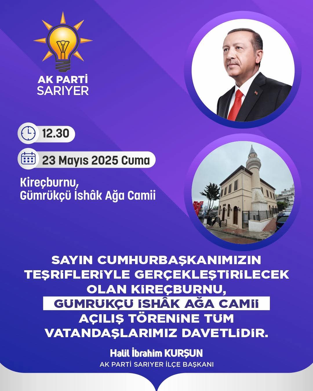 Cumhurbaşkanı Recep Tayyip Erdoğan, 23 Mayıs Cuma günü Sarıyer’de cami açacak. Depremde hasar gördüğü için yıkılıp yeniden inşaa edilen Kireçburnu Gümrükte İshak Ağa Camisi Cumhurbaşkanı Erdoğan tarafından açılacak. Cuma namazından önce saat 12.30’da yapılacak açılışa tüm vatandaşlar davetli. Açılış 21-25 Mayıs arasında gerçekleştirilecek Uluslararası 12. Sarıyer Edebiyat Günlerinin yapılacağı Kireçburnu sahilinde, Güverte Sosyal Tesisleri’nin karşındaki tarihi camide olacak.