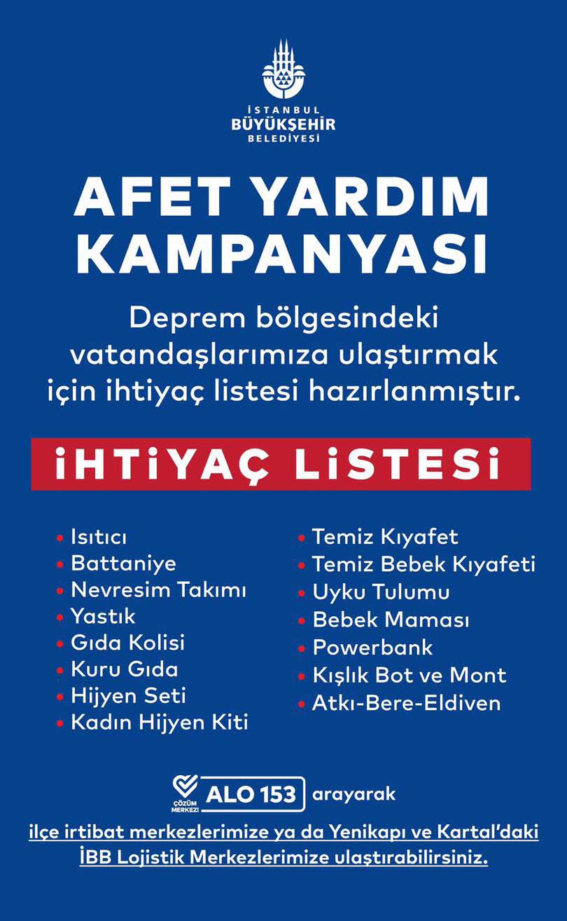 Bağış yapmak isteyen İstanbullular ALO 153 Çözüm Merkezi numarası üzerinden ‘Deprem Hattı’na bağlanarak ihtiyaç listelerine ulaşabilirler. İstanbullular, yardım malzemelerini Yenikapı Avrasya Gösteri Merkezi ile Kartal Lojistik Merkezi’ne bırakabilirler. Yardım kampanyası kapsamında ikinci ürünler kabul edilmeyecek, sadece kullanılmamış ürünler değerlendirilecek.