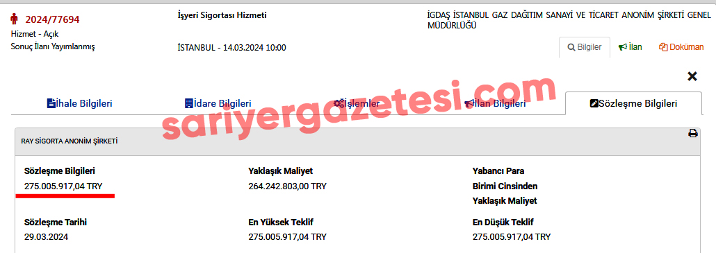 340 milyonluk ihaleyi alan Ray Sigorta, İGDAŞ’ın 2024 yılı sigorta ihalesini de kazanmıştı. 2024/77694 kayıt numaralı ihale, 14 Mart 2024 tarihinde düzenlendi. 12 aylık hizmet süresi bulunan ihalede, yaklaşık maliyet 264 milyon 242 bin lira olarak belirlendi. İhaleye tek başına katılan RAY Sigorta, verdiği tek teklifle rakipsiz ve rekabetsiz şekilde 275 milyon 5 bin lira işin sahibi oldu. Yaklaşık maliyetten 11 milyon lira fazla teklif vermesine rağmen İGDAŞ ile şirket arasında 29 Mart 2024 tarihinde sözleşme imzalandı. Böylece RAY Sigorta’nın son iki yılda İGDAŞ’tan rakipsiz-rekabetsiz şekilde aldığı 2 ihalenin toplam bedeli 615 milyonu geçmiş oldu.