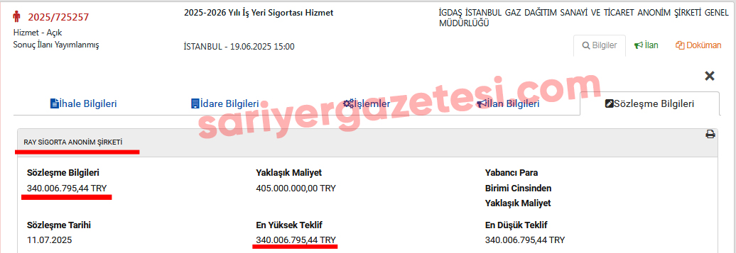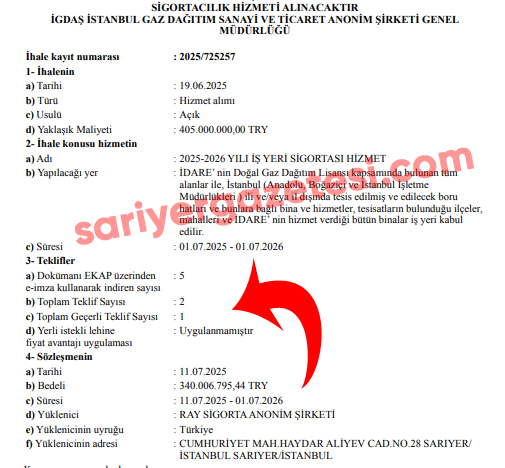 İGDAŞ’ın 2025/725257 kayıt numarasıyla düzenlediği “sigortacılık hizmeti alımı” ihalesi 16 Haziran 2025 tarihinde kurumun Eyüpsultan’a bağlı Alibeyköy’deki genel müdürlük binasında yapıldı. 2025-2026 yılı iş yeri sigorta hizmeti ihalesinde yaklaşık maliyet 405 milyon lira olarak belirlendi. 12 aylık hizmet süresi bulunan dev ihaleye, sadece 2 şirket girdi. Ancak bu tekliflerden sadece bir tanesi geçerli sayıldı. Sarıyer Kireçburnu Haydar Aliyev Caddesi No:28 adresindeki RAY Sigorta, böylece rakipsiz ve rekabetsiz şekilde katıldığı ihaleyi tam 340 milyon 6 bin 796 lira bedelle aldı. İGDAŞ ile şirket arasında 11 Temmuz 2025 tarihinde imzalanan sözleşmeye göre 1 Temmuz 2025-1 Temmuz 2026 tarihleri arasında sigorta süresi geçerli olacak.