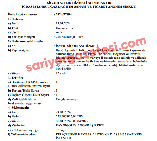 İstanbul Büyükşehir Belediyesi şirketlerinden İGDAŞ (İstanbul Gaz Dağıtım Sanayi ve Ticaret Anonim Şirketi) 2025-2026 yılları arasında şirkete ait varlıkları sigortalatmak için ihale düzenledi. Dev ihaleyi geçtiğimiz yıl da aynı ihaleyi rakipsiz-rekabetsiz şekilde kazanan RAY Sigorta aldı.