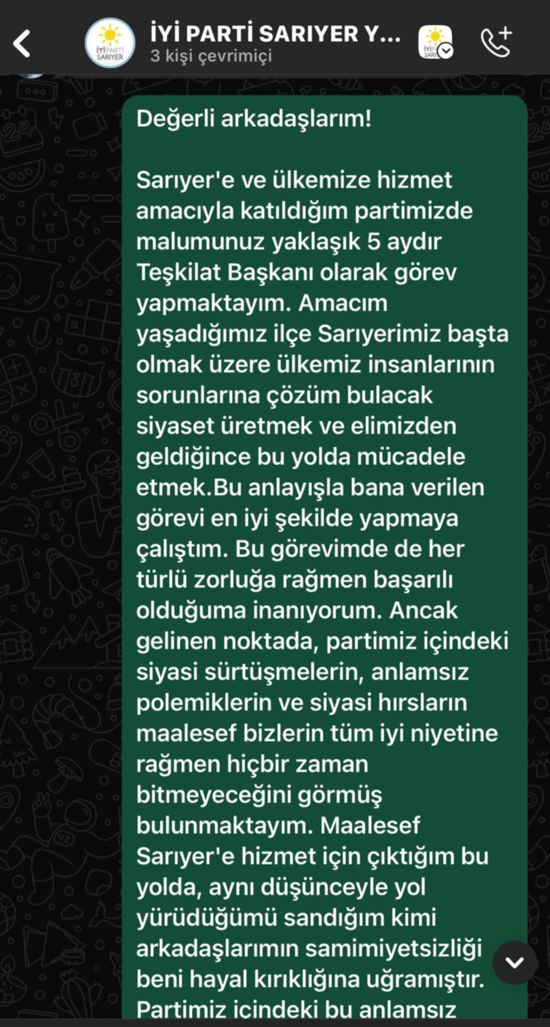 Değerli arkadaşlarım! Sarıyer’e ve ülkemize hizmet amacıyla katıldığım partimizde malumunuz yaklaşık 5 aydır Teşkilat Başkanı olarak görev yapmaktayım. Amacım yaşadığımız ilçe Sarıyerimiz başta olmak üzere ülkemiz insanlarının sorunlarına çözüm bulacak siyaset üretmek ve elimizden geldiğince bu yolda mücadele etmek.Bu anlayışla bana verilen görevi en iyi şekilde yapmaya çalıştım. Bu görevimde de her türlü zorluğa rağmen başarılı olduğuma inanıyorum. Ancak gelinen noktada, partimiz içindeki siyasi sürtüşmelerin, anlamsız polemiklerin ve siyasi hırsların maalesef bizlerin tüm iyi niyetine rağmen hiçbir zaman bitmeyeceğini görmüş bulunmaktayım. Maalesef Sarıyer’e hizmet için çıktığım bu yolda, aynı düşünceyle yol yürüdüğümü sandığım kimi arkadaşlarımın samimiyetsizliği beni hayal kırıklığına uğramıştır. Partimiz içindeki bu anlamsız sürtüşmeler ben ve benimle birlikte yürüyen çevremdeki dostlarımı da üzmüştür. Benim aldığım siyasi kültür ve siyasi terbiye bu samimiyetsizliği asla kabul etmemektedir. İşte bu ve buna benzer pek çok nedenden dolayı İYİ Parti Sarıyer İlçe Teşkilat Başkanlığı görevimden ve parti üyeliğimden istifa etmiş bulunuyorum. Hepinize sevgilerimi sunuyorum…