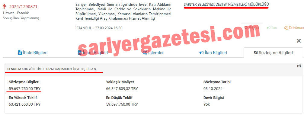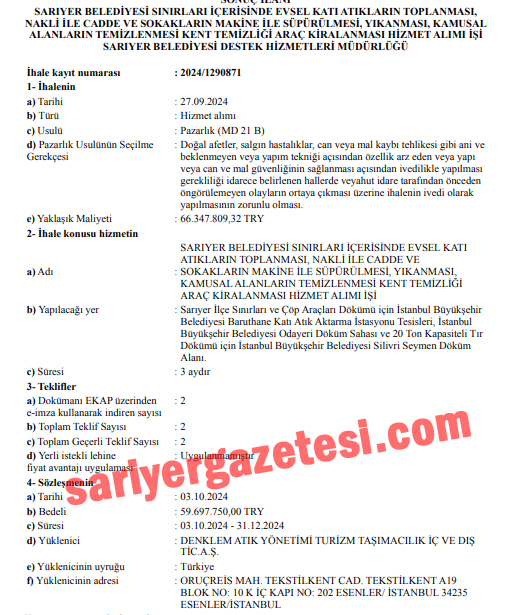 21/B pazarlık usulü ile yapılan ihaleye sadece Sarıyer Belediyesi’nin özel olarak seçip davet ettiği 2 şirket katıldı. Hizmet süresi 3 ay olarak belirlenen ihale kapsamında, işi alacak şirketten 3 Ekim 2024 ile 31 Aralık 2024 arasında belediyeye hizmet etmesi istendi. İhaleyi Albayrak Grubu bünyesindeki DENKLEM ATIK YÖNETİMİ TURİZM TAŞIMACILIK İÇ VE DIŞ TİC.A.Ş. kazandı. Sarıyer Belediyesi ile DENKLEM ATIK şirketi arasında 3 Ekim 2024 tarihinde 59 milyon 697 bin 750 liralık sözleşme imzalandı. Asıl büyük ihaleyi Aralık sonunda yapması beklenen Sarıyer Belediyesi, DENKLEM ATIK şirketine bugüne kadar çok sayıda ihale vermişti. Esenler ilçesi Oruçreis Mahallesi merkezli Denklem Atık şirketi, başta Sarıyer olmak üzere pek çok belediyeden yüzlerce milyonluk ihaleler almasıyla dikkat çekiyor.
