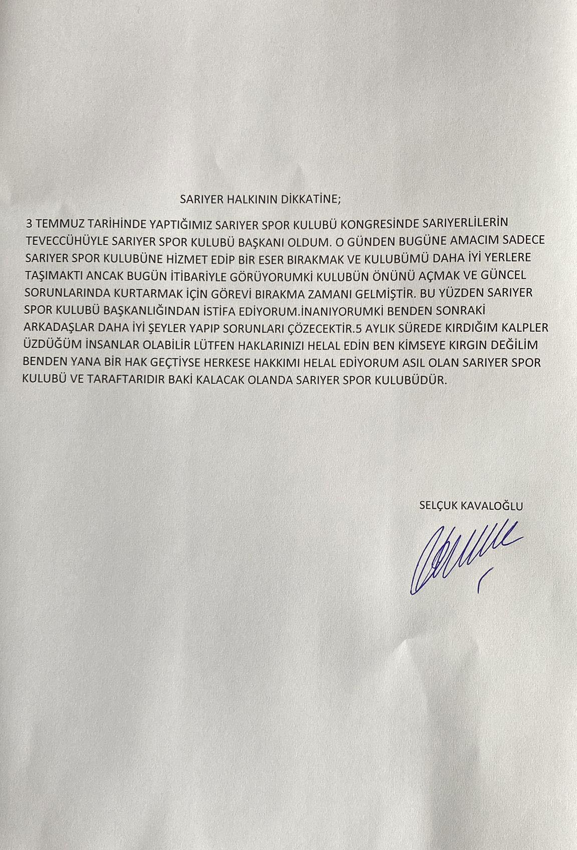 İşte Sarıyer Spor Kulübü Başkanı Selçuk Kavaloğlu’nun istifa yazısı:
