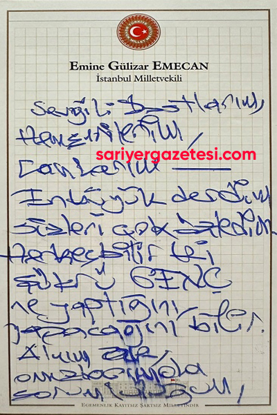 CHP Antalya Eski Milletvekili ve son seçimlerde Bahçelievler Belediye Başkan Adayı İnşaat Mühendisi Emine Gülizar Emecan, 155 gündür Marmara İnfaz Kurumu’nda (Silivri Cezaevi) tutuklu bulunan Sarıyer Belediyesi Eski Başkanı Şükrü Genç’i ziyaret etti. Sevenlerine Emecan aracılığıyla mektup gönderen Genç; mektubunda şu mesajları verdi;
