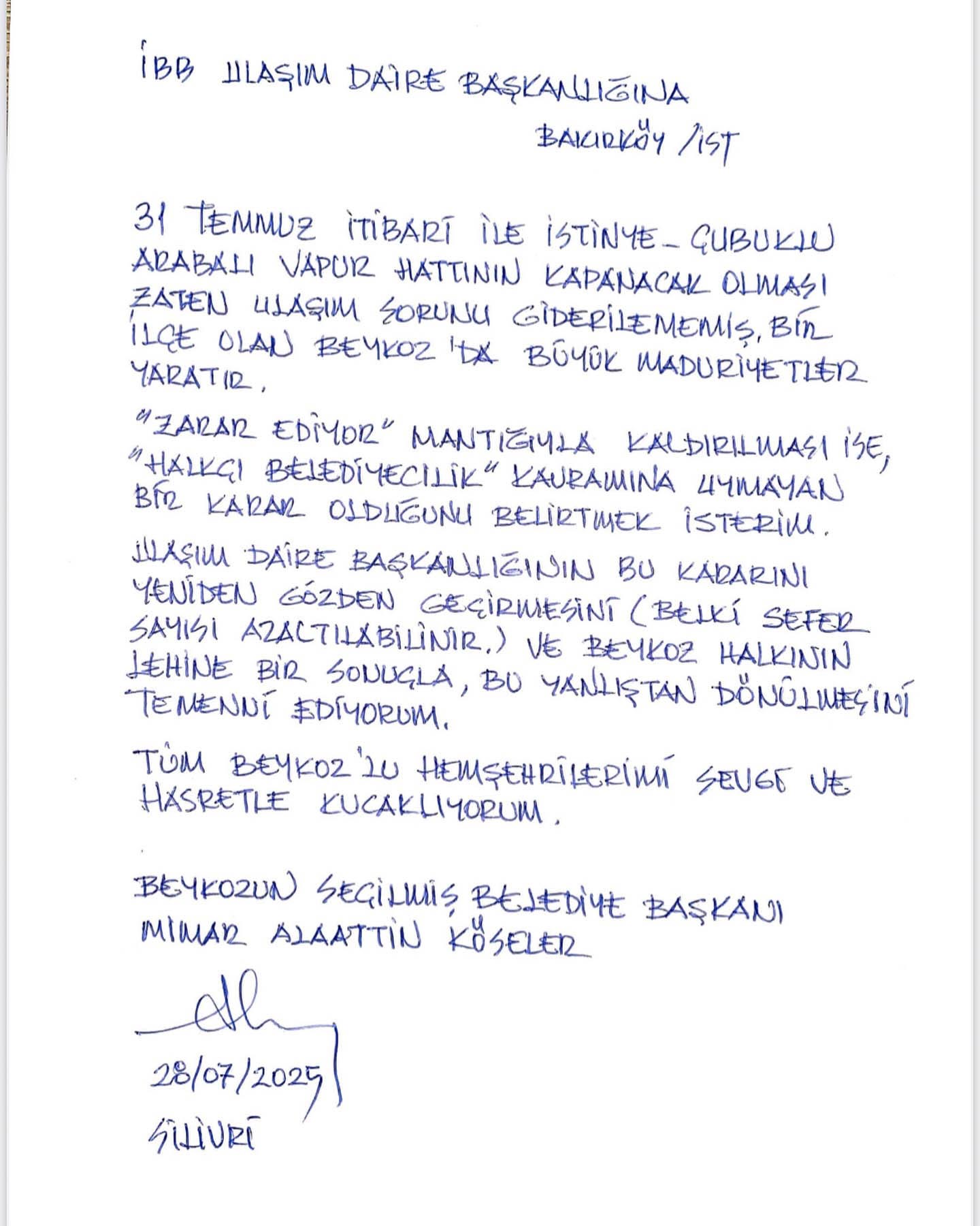 Beykoz Belediyesi’ne Mart ayında düzenlenen yolsuzluk operasyonu sonucu tutuklanarak cezaevine gönderilen CHP’li Belediye Başkanı Alattin Köseler, Silivri Cezaevi’ndeyken bile Beykoz ve Sarıyer’in ortak sorununa kayıtsız kalmadı. 31 Temmuz 2025 itibariyle Sarıyer İstinye -Beykoz Çubuklu Arabalı Vapur Seferleri‘nin iptal edileceğini öğrenen Köseler, karara cezaevinden tepki gösterdi. Silivri Cezaevi’nden İstanbul Büyükşehir Belediyesi Ulaşım Daire Başkanlığı’na mektup yazan Köseler, “zarar ediyor” mantığıyla alınan kararın, halkçı belediyecilik anlayışına uymadığını ve kararın mutlaka gözden geçirilmesini istedi.