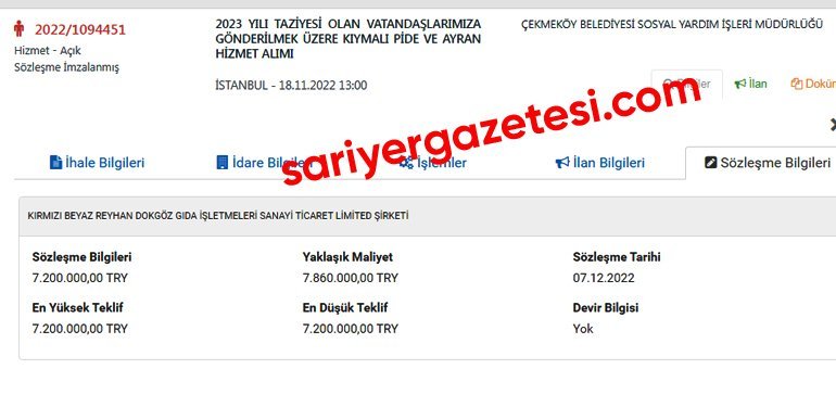 90 bin adet pide ve 90 bin adet ayranın satın alınacağı ihaleyi 7 milyon 200 bin lira bedelle Kırmızı Beyaz Reyhan Dokgöz Gıda İşletmeleri Sanayi Ticaret Limited Şirketi aldı. İhalede bu şirketten başka geçerli teklif sunan olmadı. Böylece ihalede en düşük ve en yüksek bu şirketten gelmiş oldu. Şirket ile belediye arasında 7 Aralık 2022 tarihinde ihale sözleşmesi imzalandı.