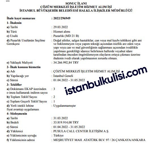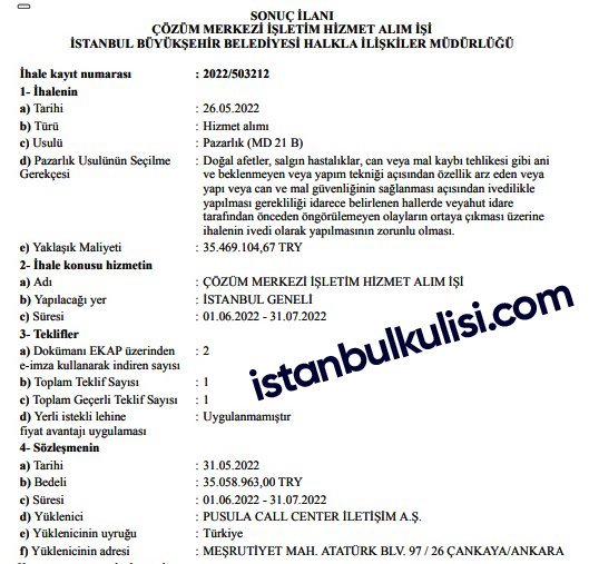 İSTANBULKULİSİ.COM Genel Yayın Yönetmeni Bekir Batu‘nun yaptığı özel araştırmaya göre; PUSULA Call Center İletişim Şirketi’nin İBB Halkla İlişkiler Müdürlüğü’den aldığı ilk ihale, hizmet süresi 1 Nisan-31 Mayıs 2022 tarihlerini kapsayan 33 milyon 819 bin liralık ihale oldu. İhalenin sözleşmesi 31 Mart’ta imzalanırken, ihaleye bu şirketten başka geçerli teklif sunan olmadı. Şirketin aldığı ikinci ihale ise hizmet süresi 1 Haziran ve 31 Temmuz tarihleri arasını kapsayan 35 milyon 58 bin liralık ihale oldu. Rakipsiz olarak gerçekleştirilen bu ihalenin sözleşmesi ise 31 Mayıs’ta imzalandı. PUSULA’nın aldığı son iş ise 42 milyon 969 bin 817 liralık ihale oldu. Sözleşmesi 29 Temmuz’da imzalanan ihalede hizmet süresi 1 Ağustos-30 Eylül 2022 olarak belirtildi. Bu son ihalede de şirket işin rakipsiz ve rekabetsiz bir şekilde sahibi oldu. PUSULA’nın aldığı toplamı 112 milyonu bulan ihalelerin tamamı 21-B maddesine göre pazarlık usulüyle yapılması gözlerden kaçmadı.