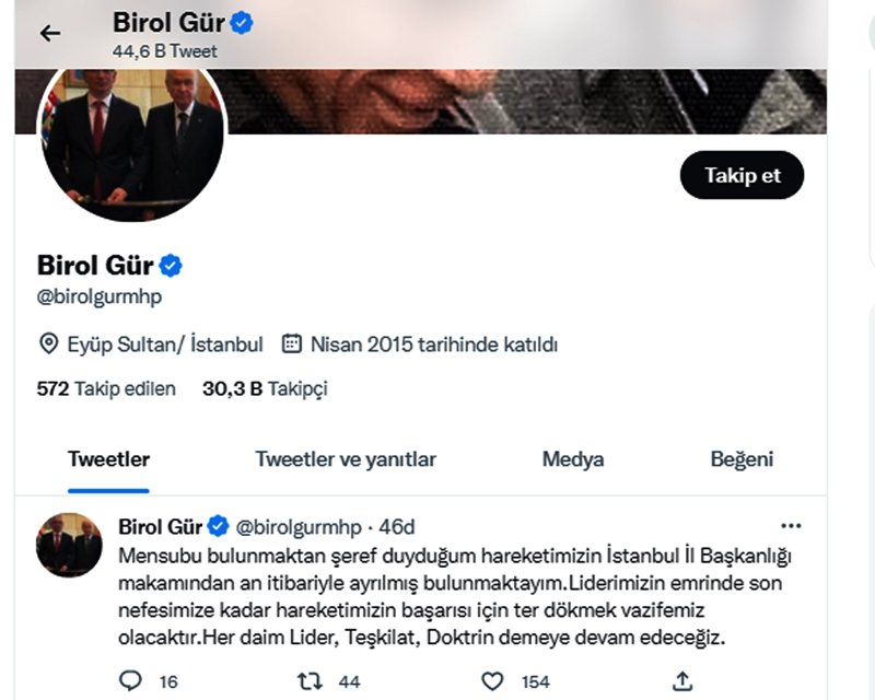 MHP İstanbul İl Başkanı Birol Gür sürpriz bir kararla istifasını açıkladı. Sosyal medya hesabından paylaşım yapan Gür; “Mensubu bulunmaktan şeref duyduğum hareketimizin İstanbul İl Başkanlığı makamından an itibariyle ayrılmış bulunmaktayım. Liderimizin emrinde son nefesimize kadar hareketimizin başarısı için ter dökmek vazifemiz olacaktır. Her daim lider, teşkilat, doktrin demeye devam edeceğiz” dedi.