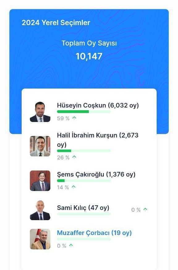 Takipçilerimize “AK Parti’den kimi belediye başkan adayı görmek istiyorsunuz” diye sormuştuk. 5 aday adayının isimlerini anket listesinde yayınlamıştık. Anketimizin gerçekçi olması ve aynı cihazdan sadece tek oy kullanılması için; spam ve hileli tüm oylar yapay zeka yazılımı sayesinde belirlenerek, bu şekilde yapıldığı tespit edilen tüm oylar geçersiz sayıldı.
